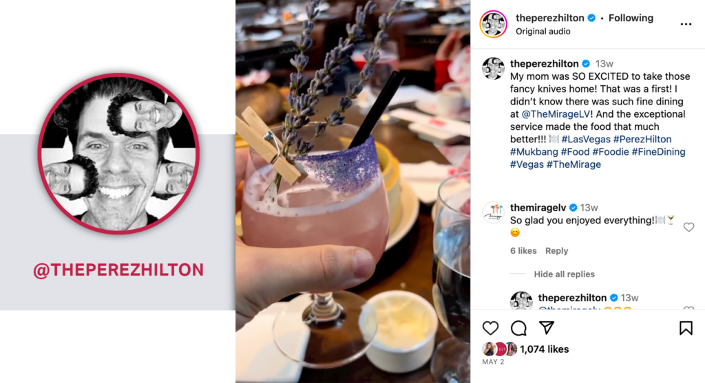 Our team implemented an influencer program to help promote specialty education series and menu offerings for the property. We hosted key influencers and VIPs including Perez Hilton and Sawyer Hemsley to experience what The Mirage offers and spread the word to their fans.